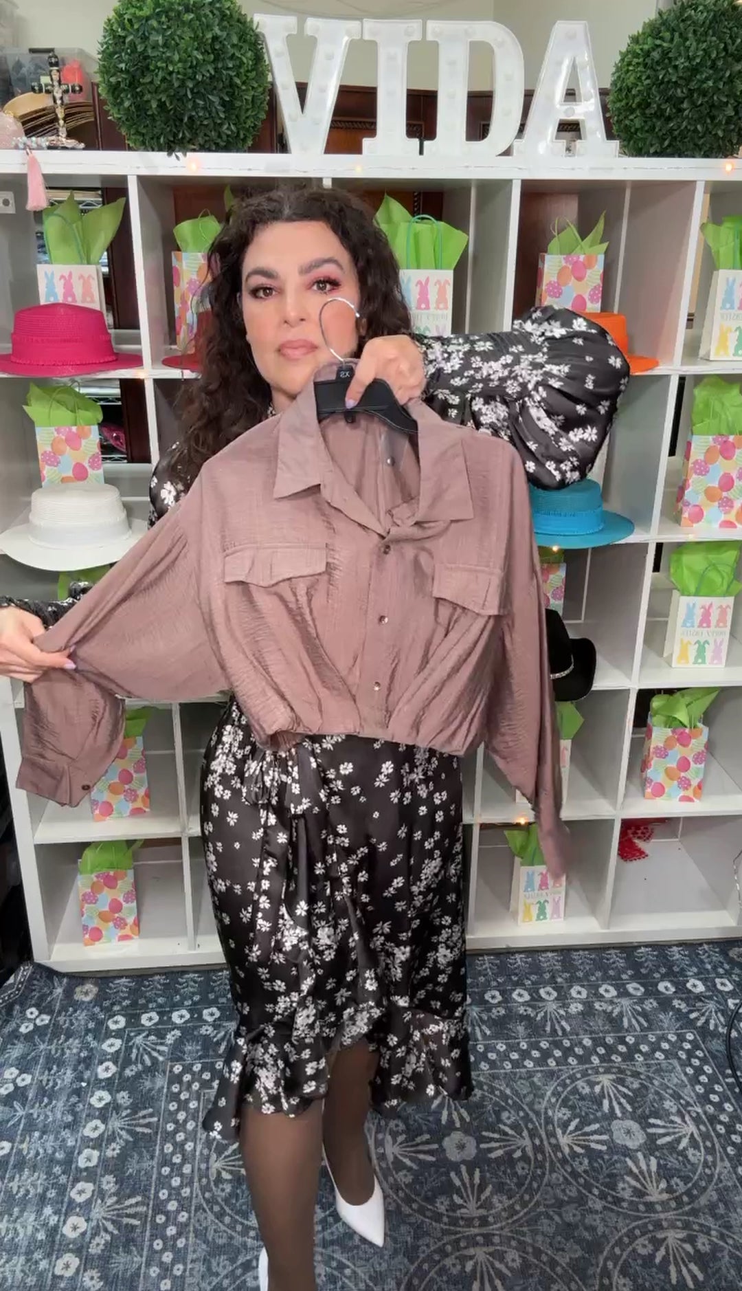 Blusa beige y negro boleada satinada con flor collar (#109)