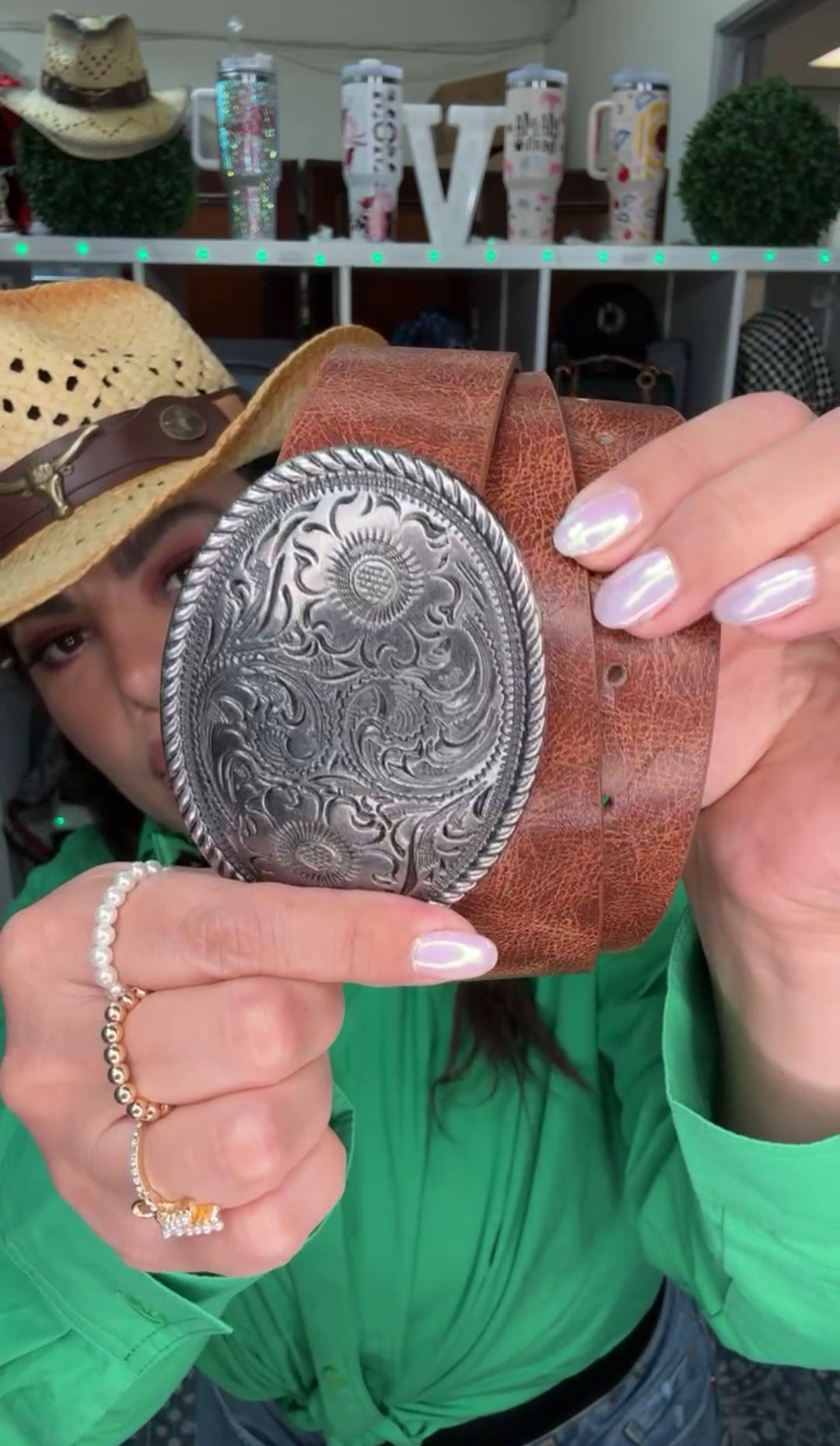 Cinto Camel Hebilla Plata Floral Labrada Ajustable (#172)