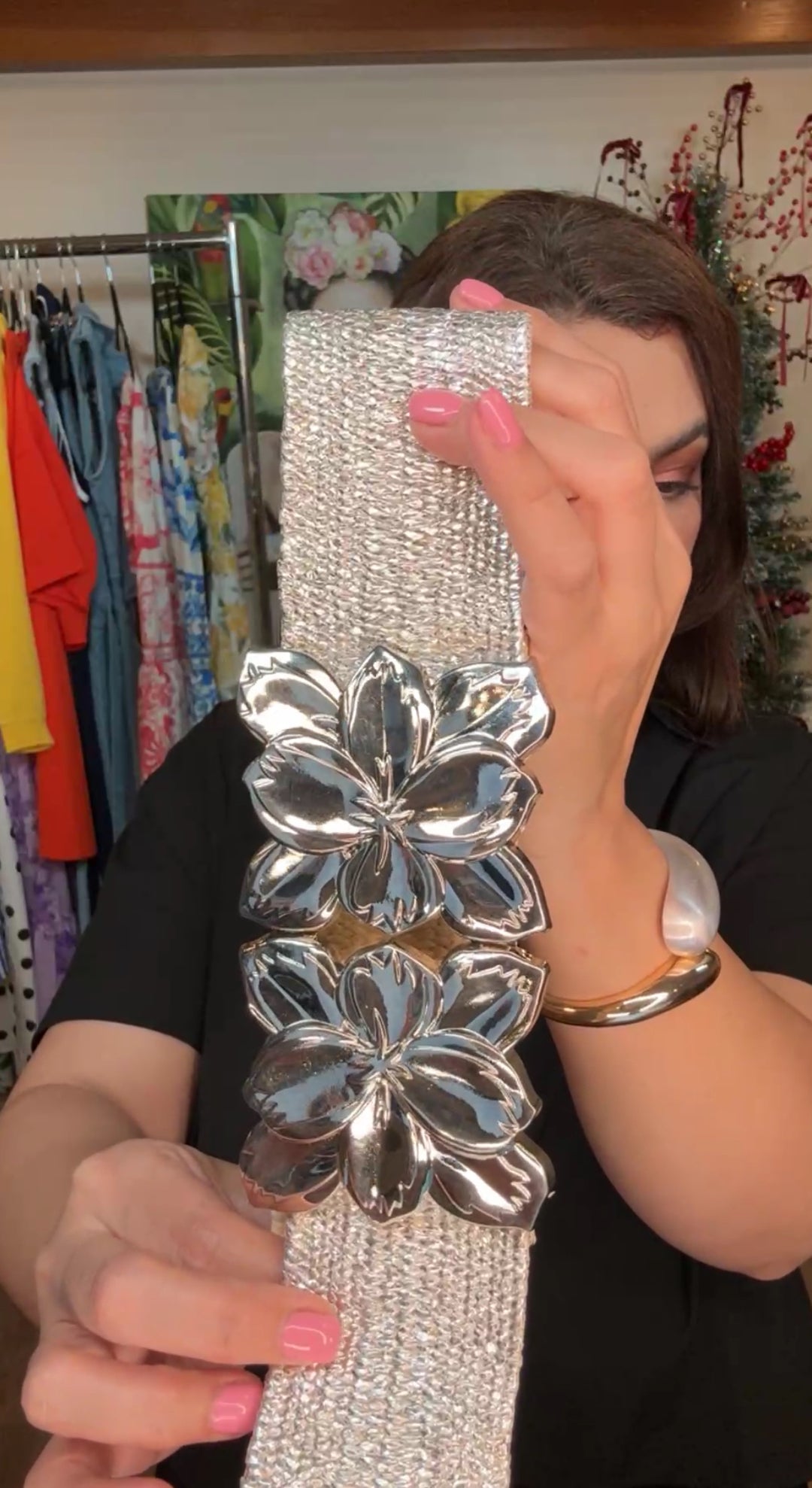 Cinto Plateado Hebilla XL Flor Ajustable (#128)