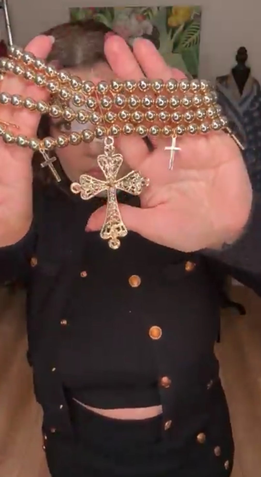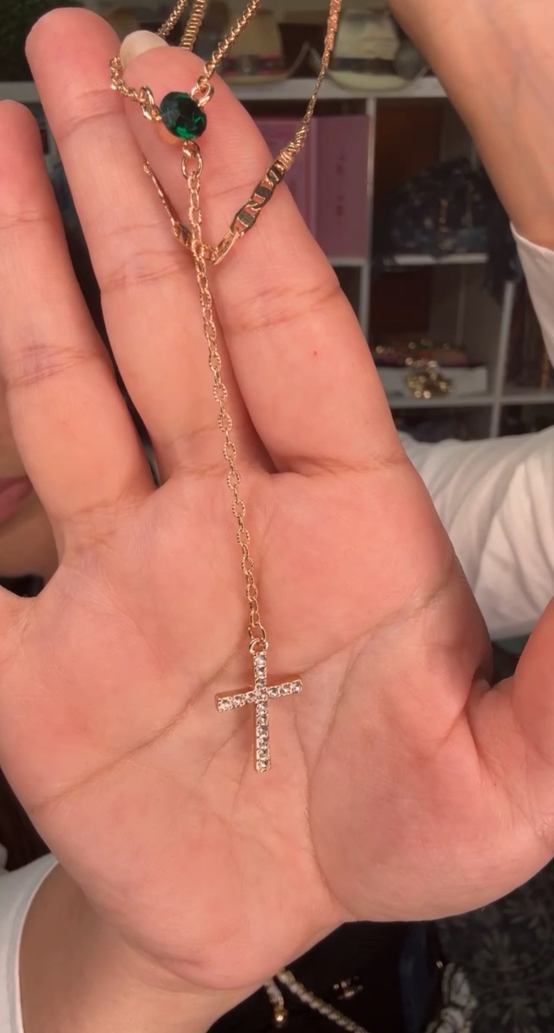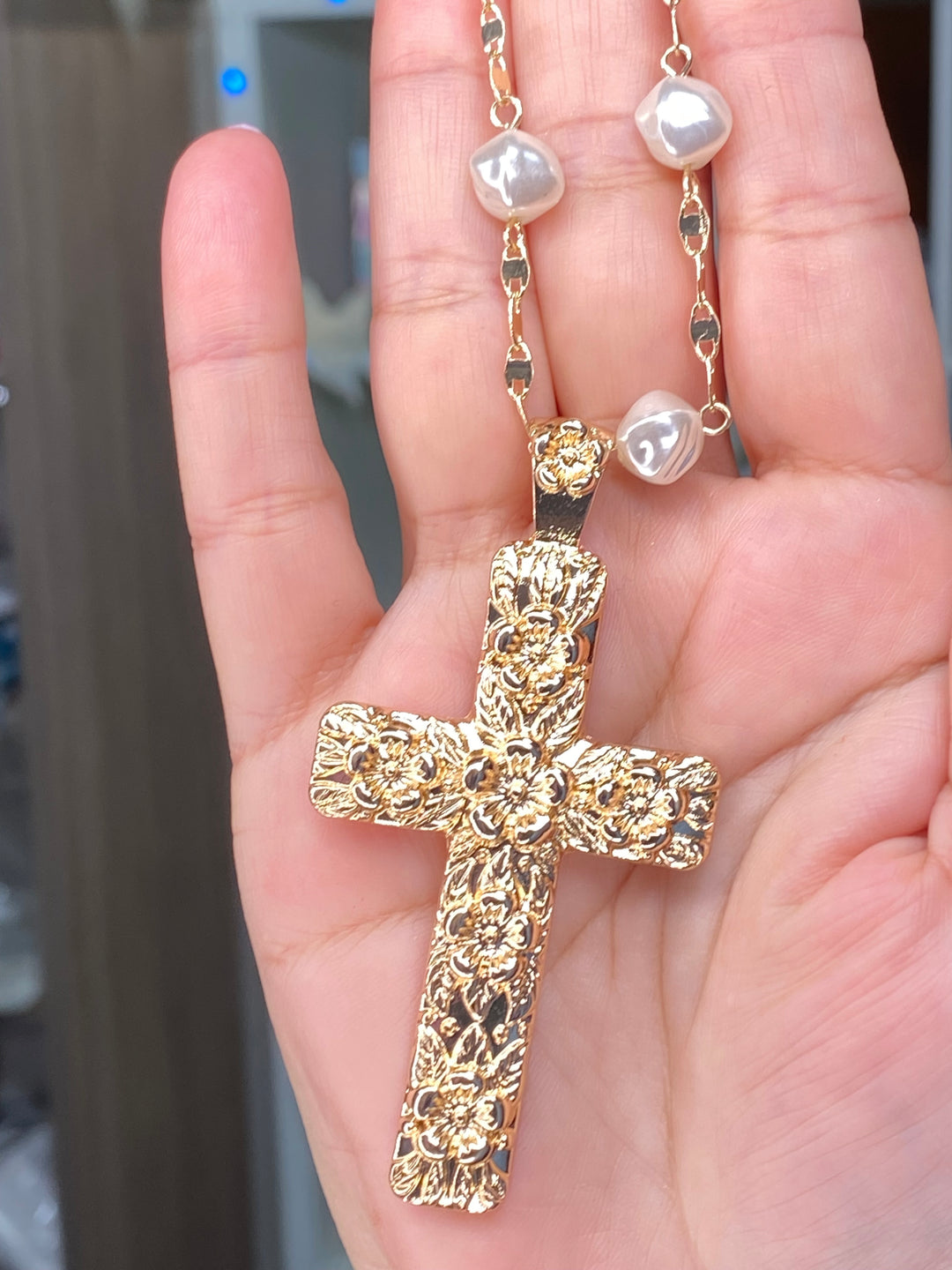 Collar Dorado Cruz con Perlas Trabajado Set (#121)