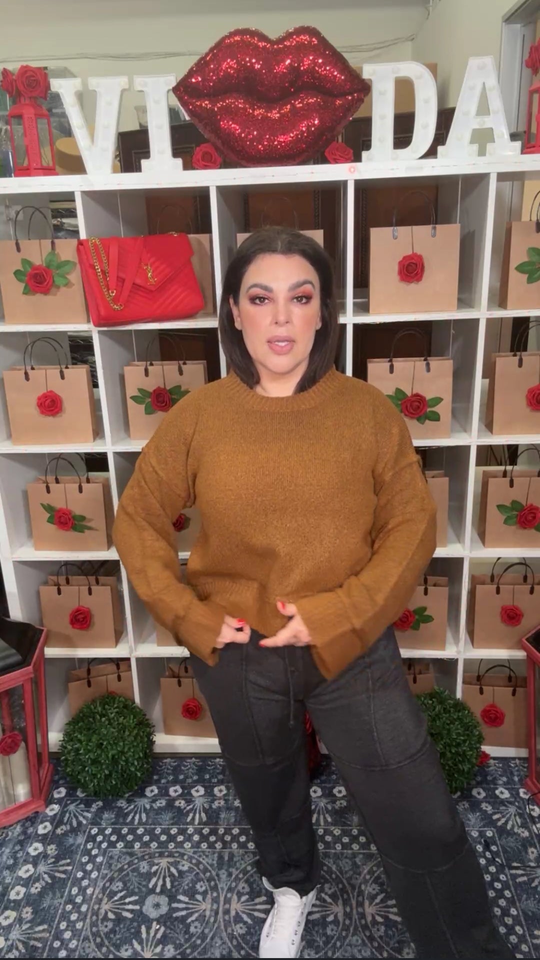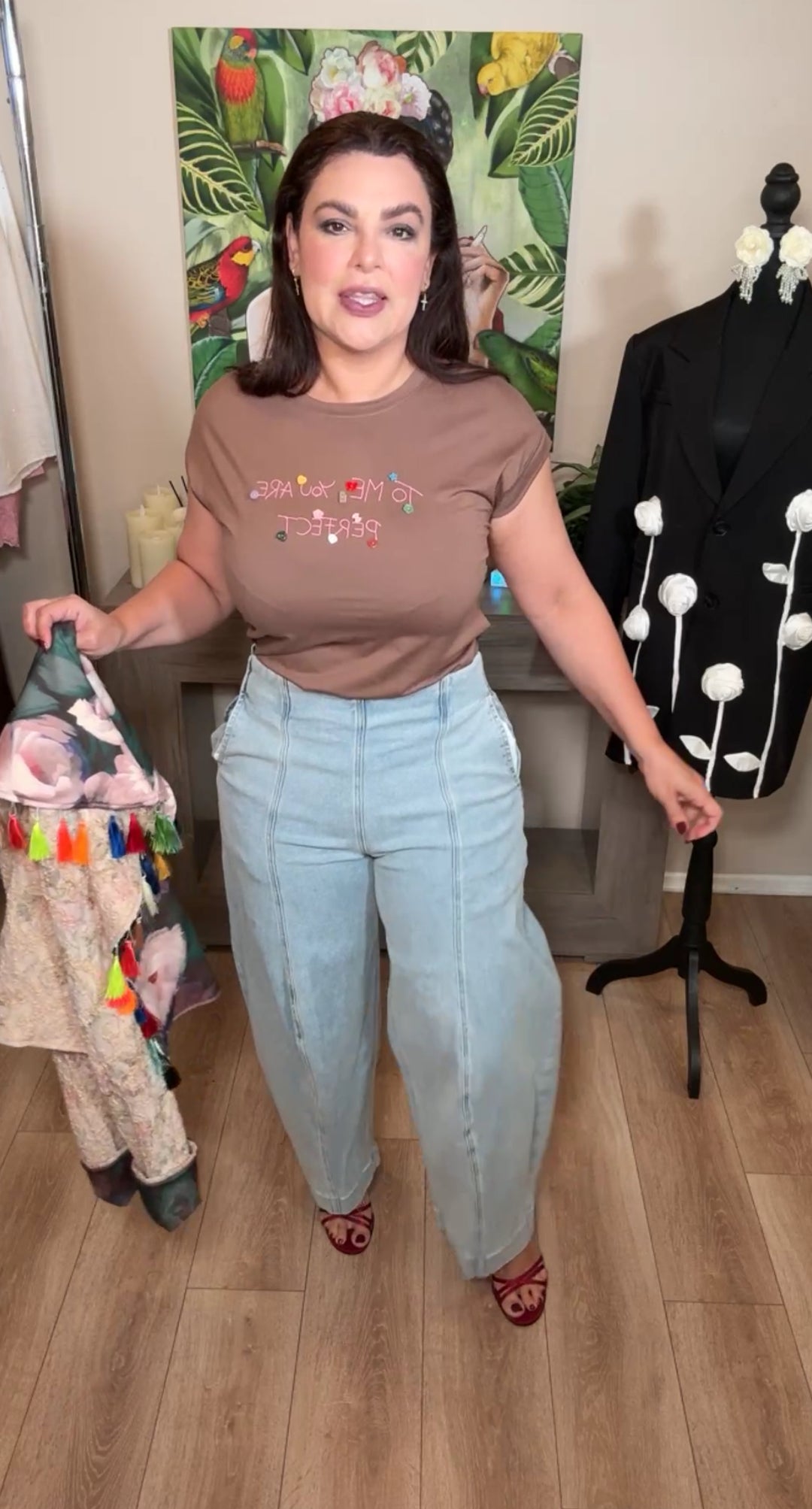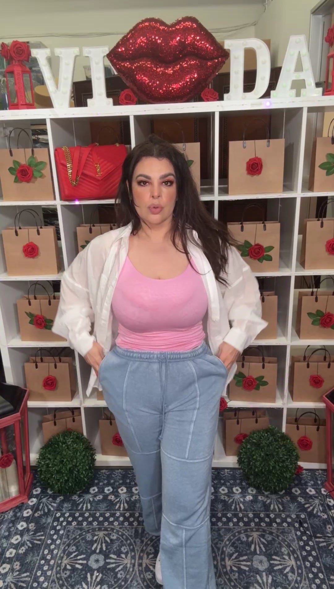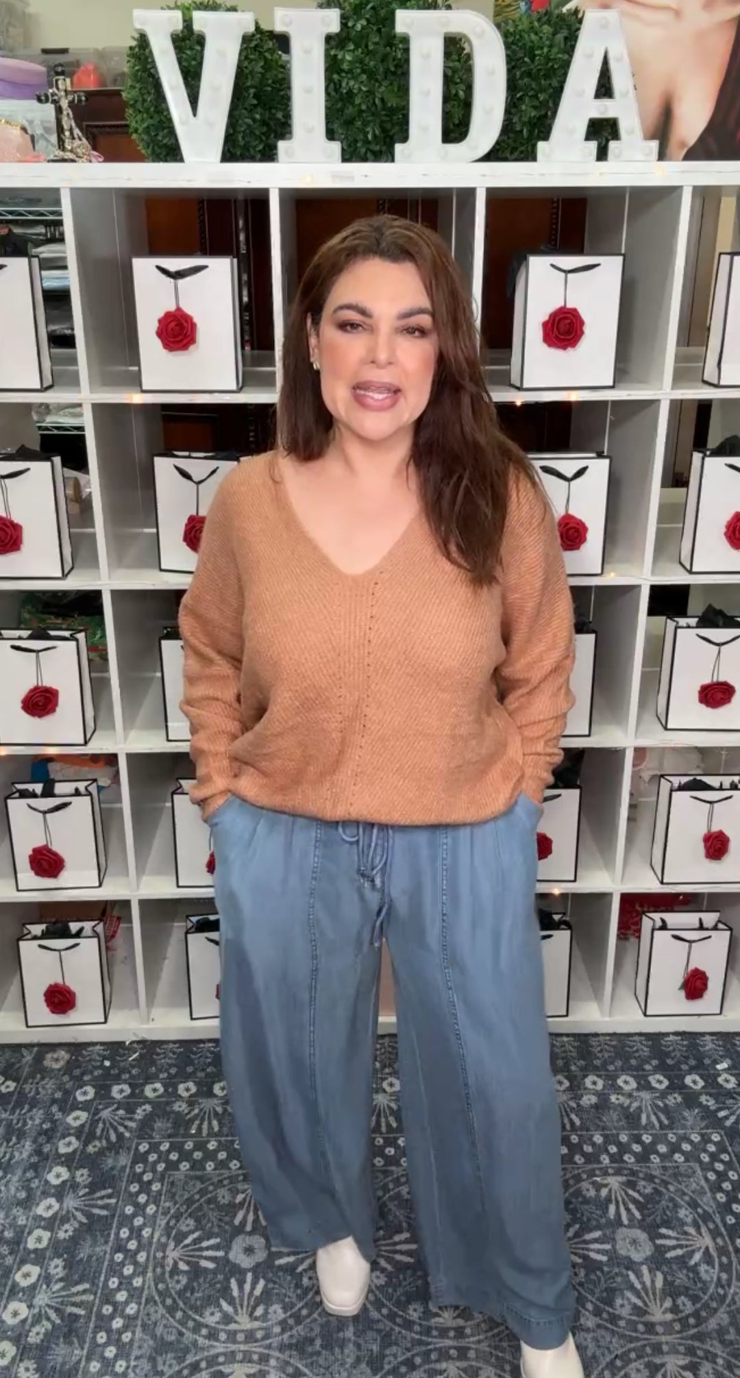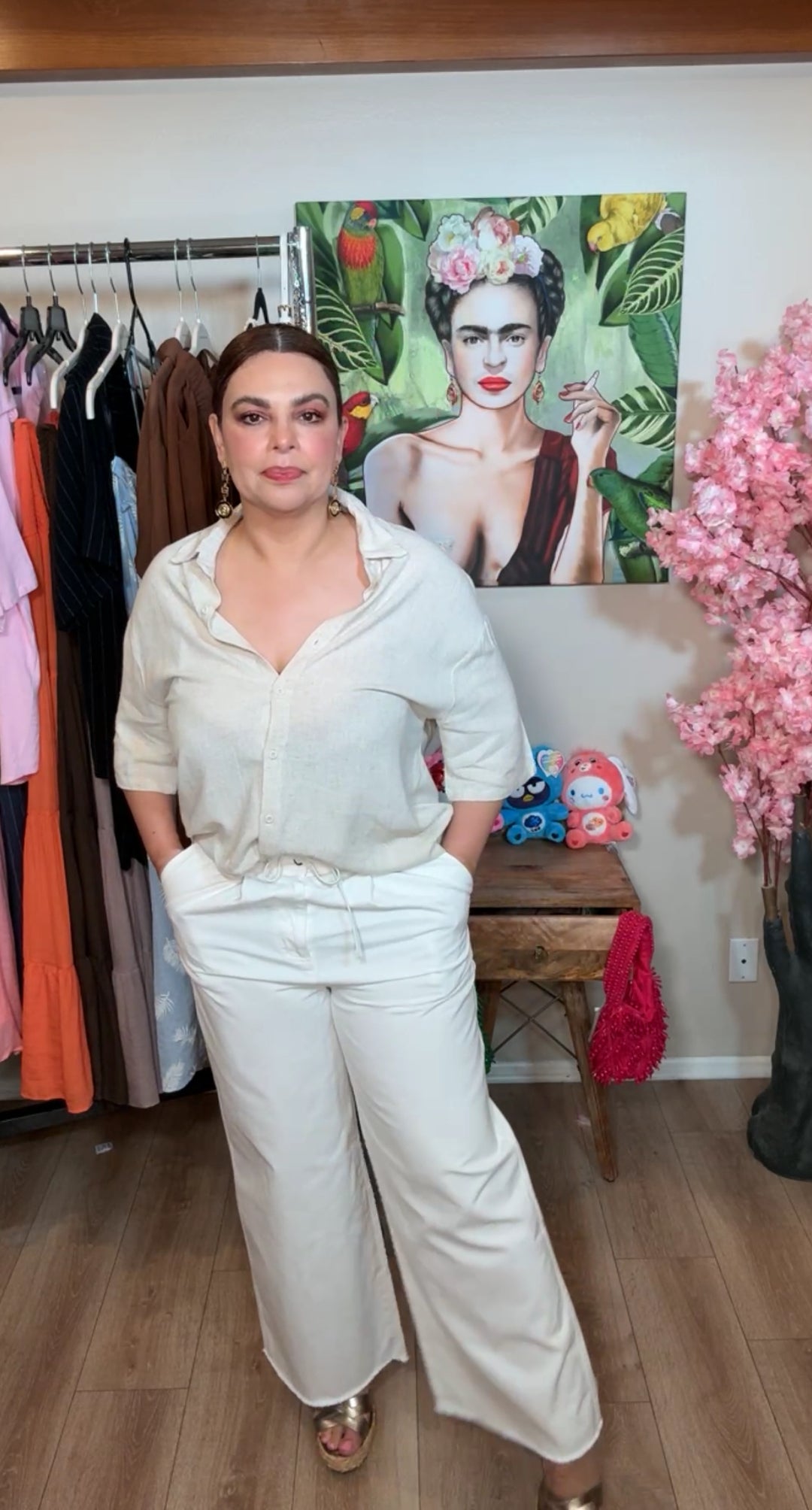 Pantalón café peto blanco y raya palazo formal