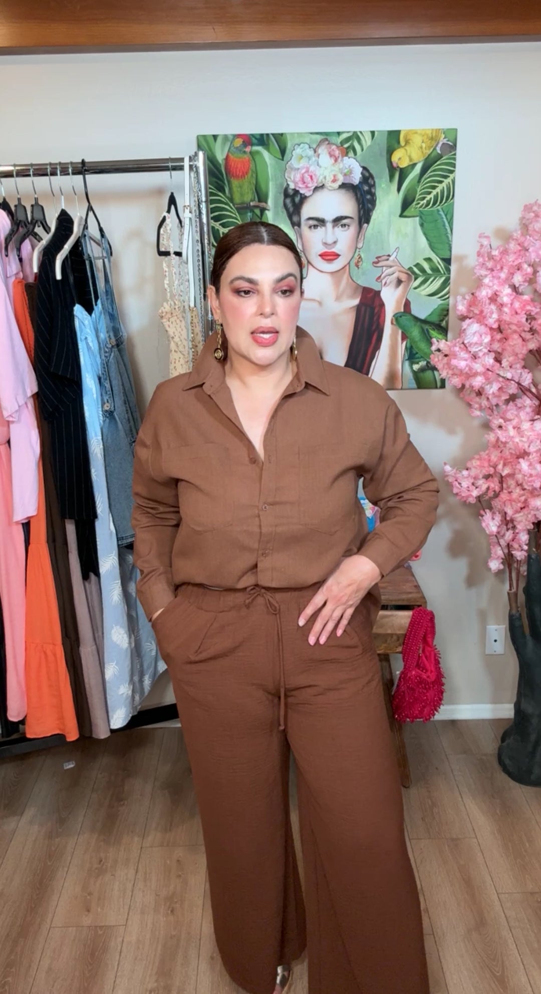 Pantalon cafe oscuro linen mix cintura stretch (#172)