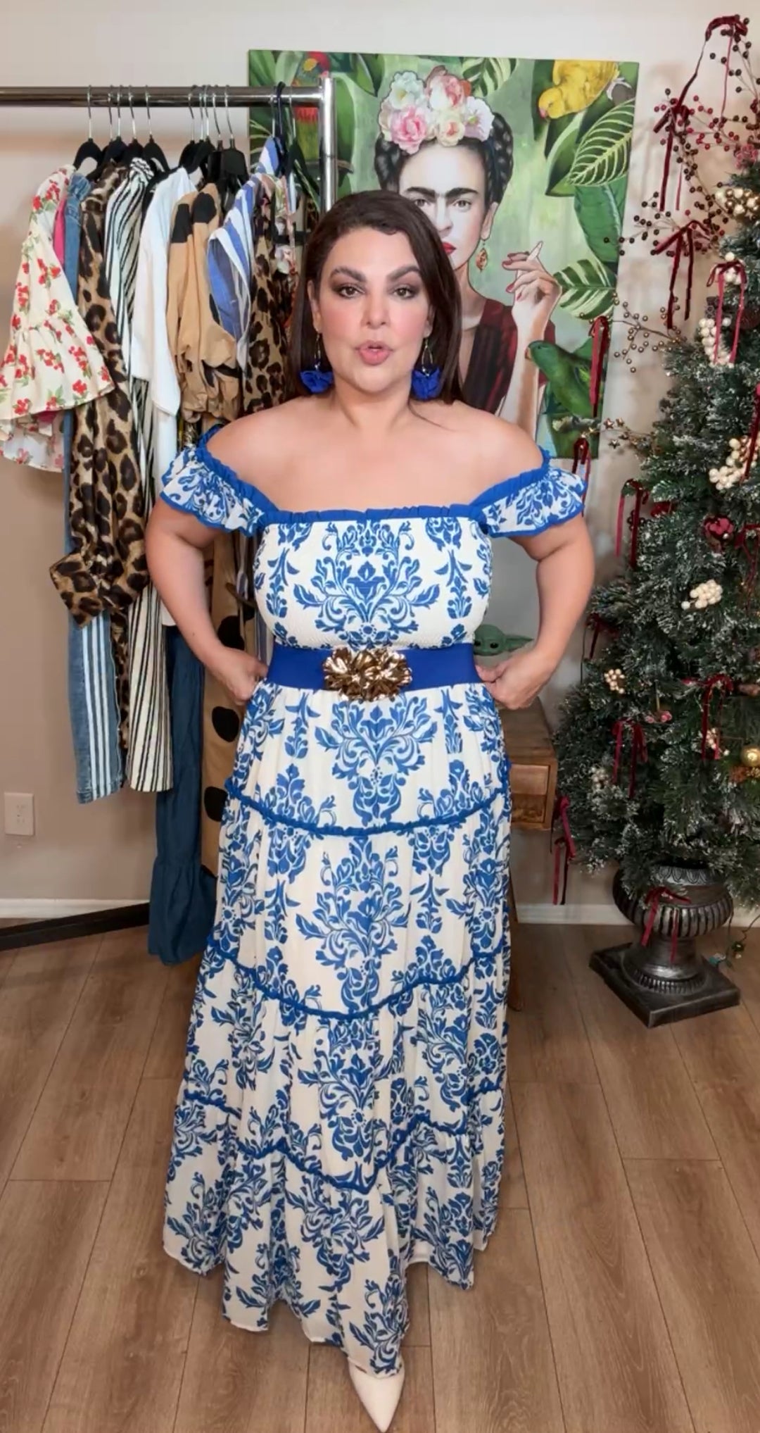 Vestido Blanco y Azul Estampado Talavera Maxi Busto Elastico (#173)