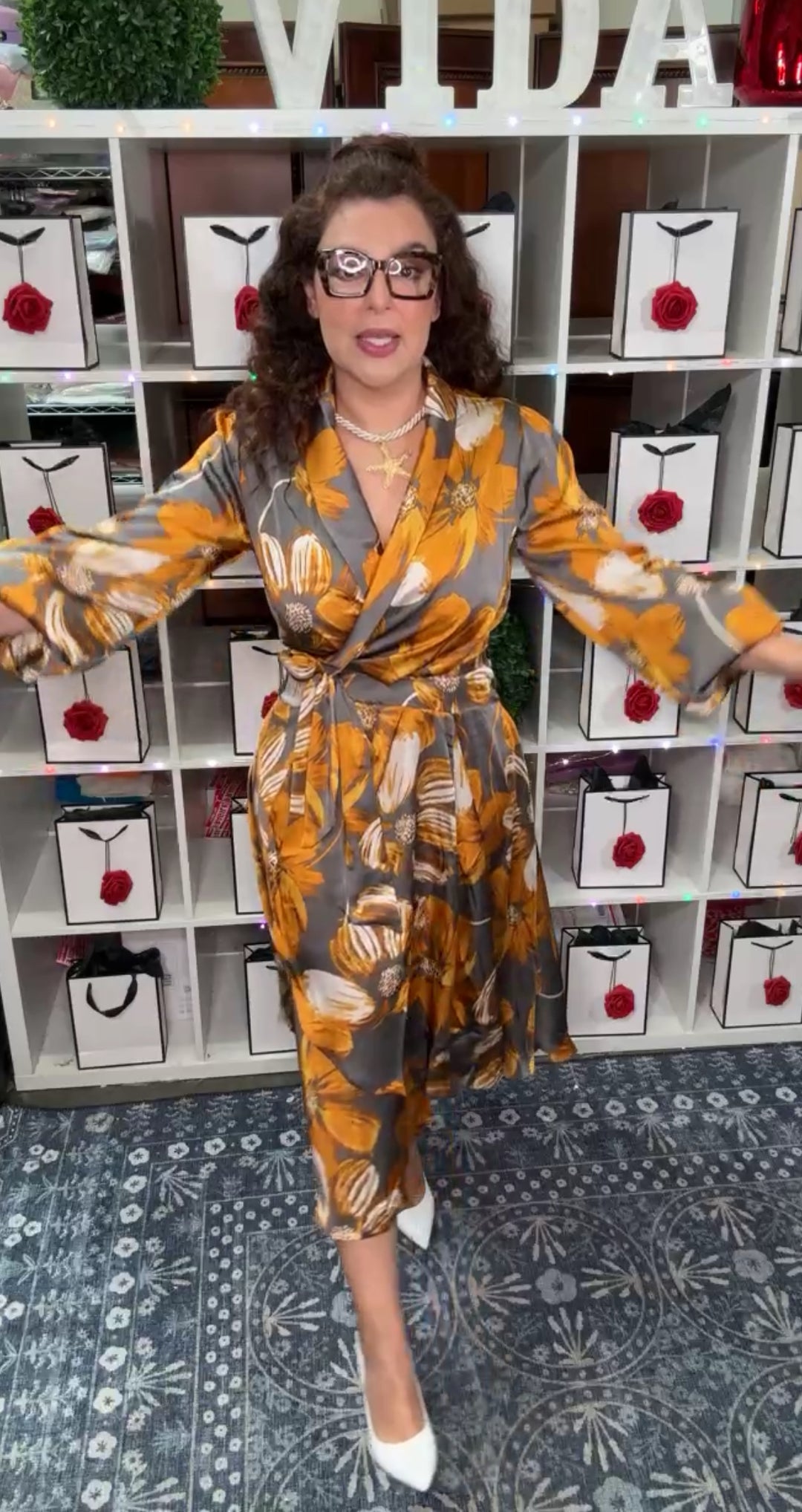 Vestido Gris y Mostaza Floral Satinado Wrap Midi (#139)