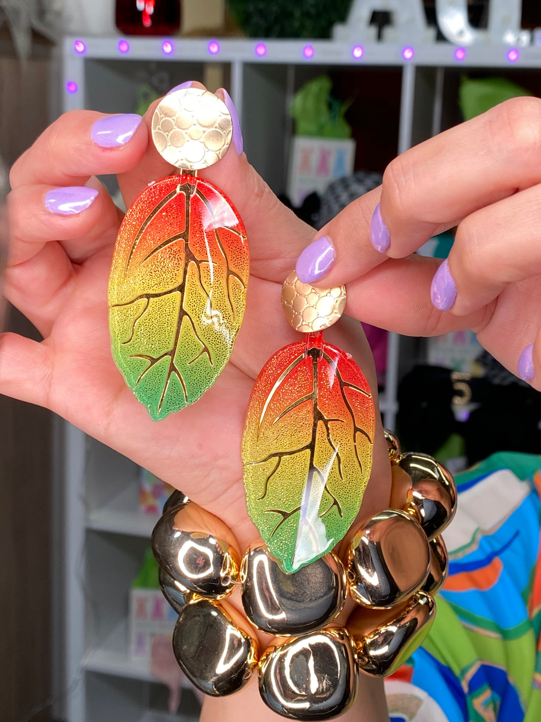 Arete Verde y Dorado Hoja Tropical Gold Dust (#172)