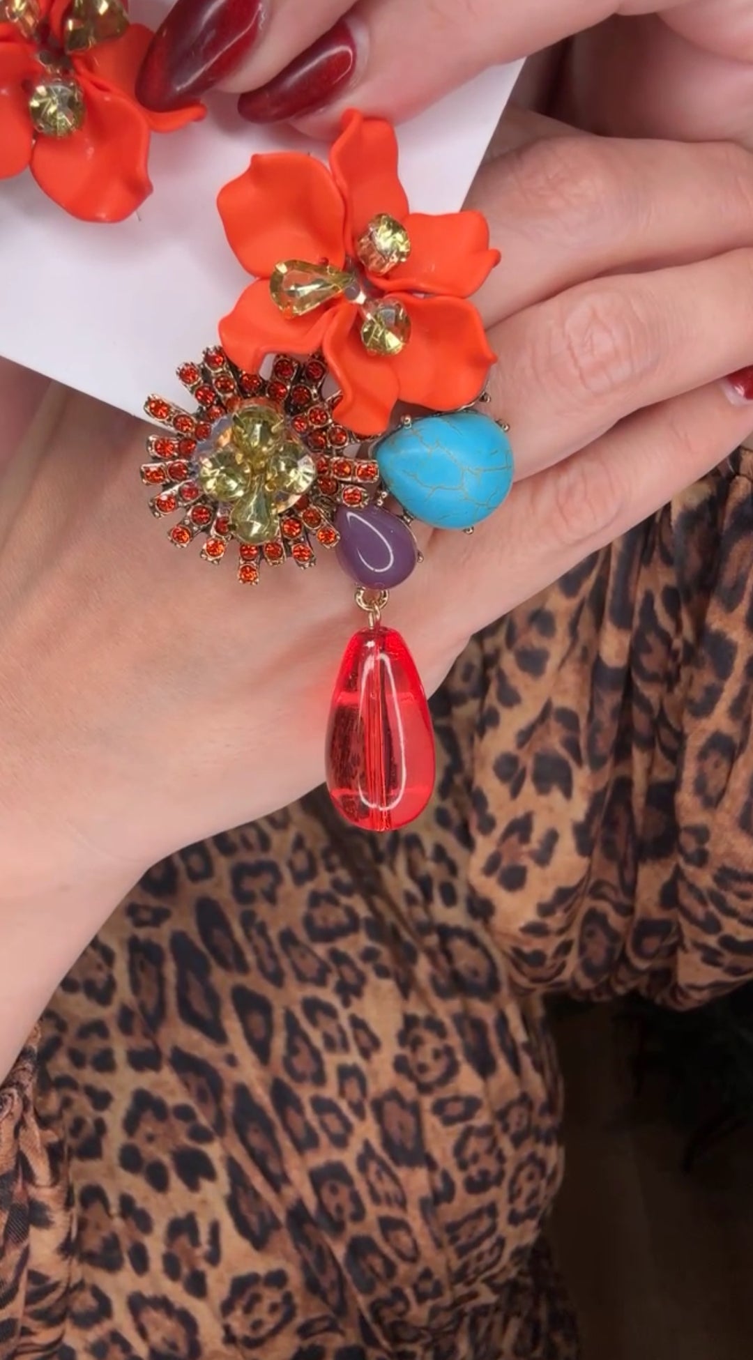 Arete rojo flor cristales