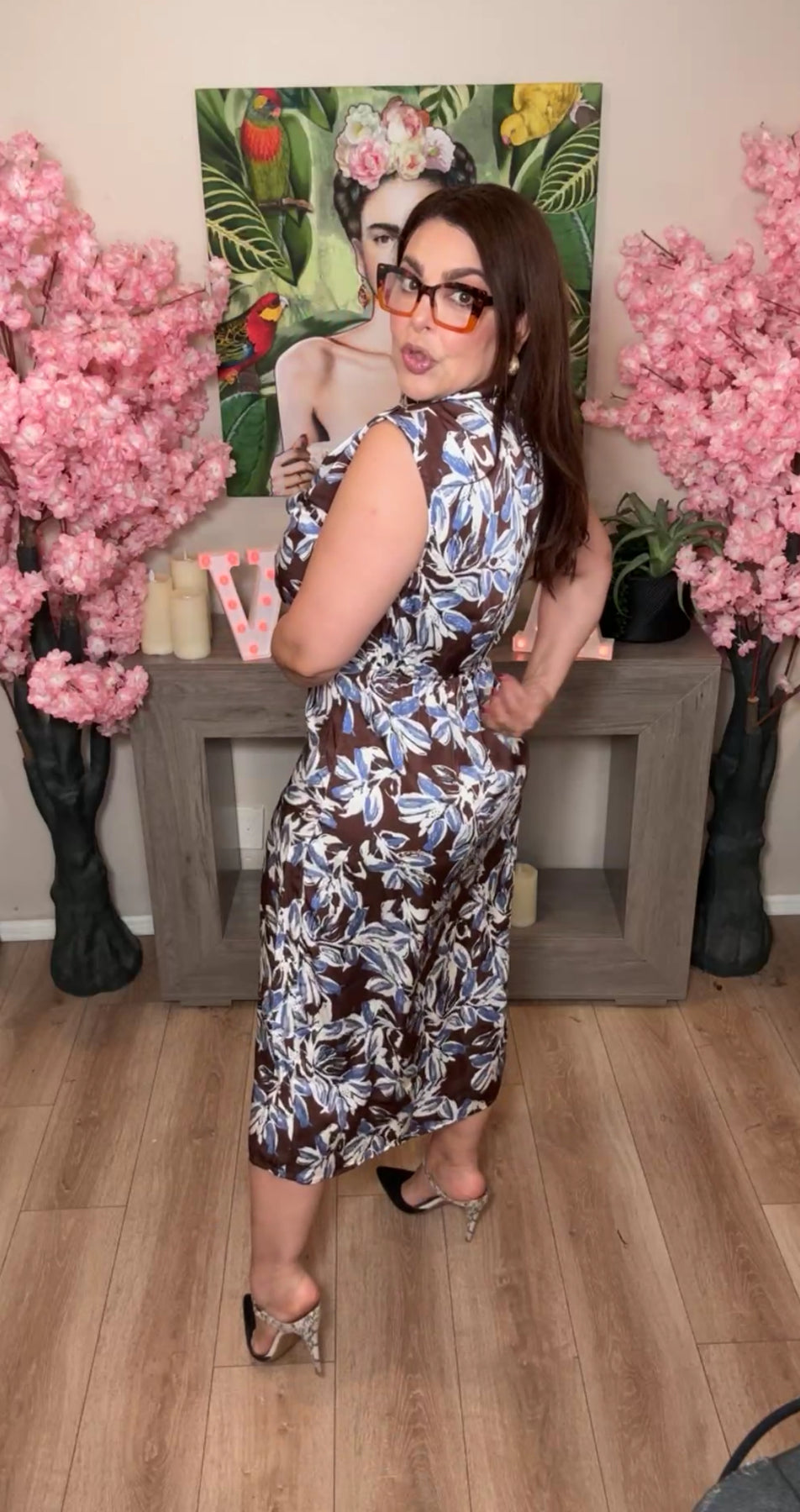Vestido café hojas blanco con azul satinado cuello desnivel midi