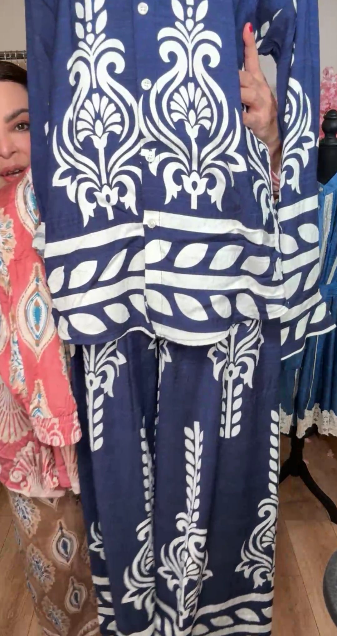 Set Azul Y Blanco Piñas Linen Blend Cintura Elástica (#128)