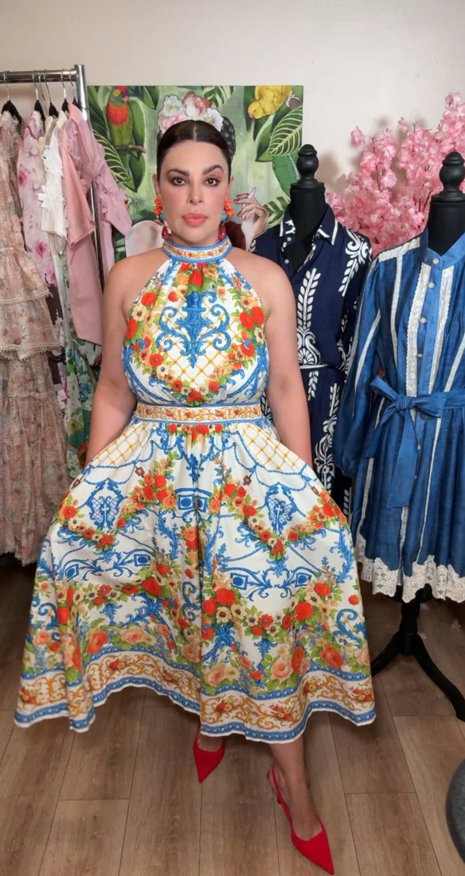 Vestido blanco diseño itialiano talavera y rosas cintura elastica midi (
