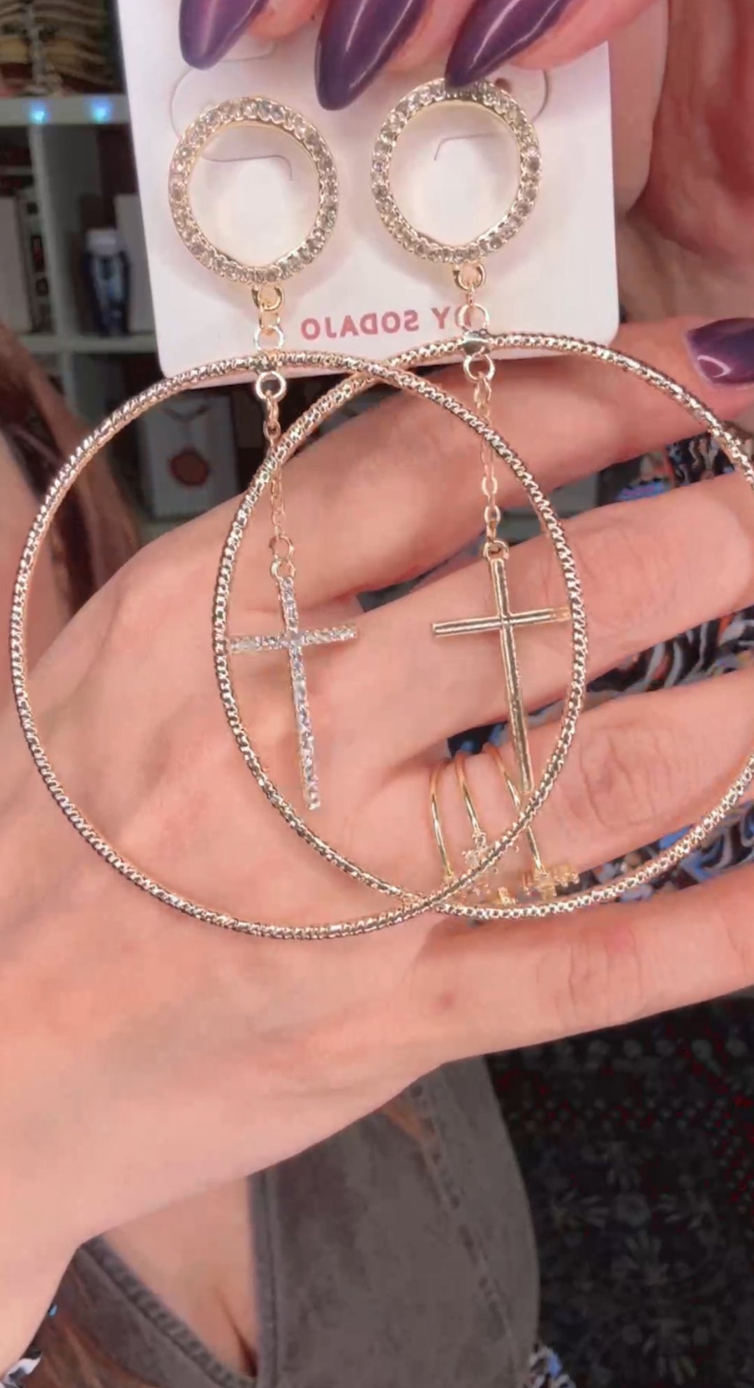 Arete dorado cruz y perlas con pedrería XL (#104)