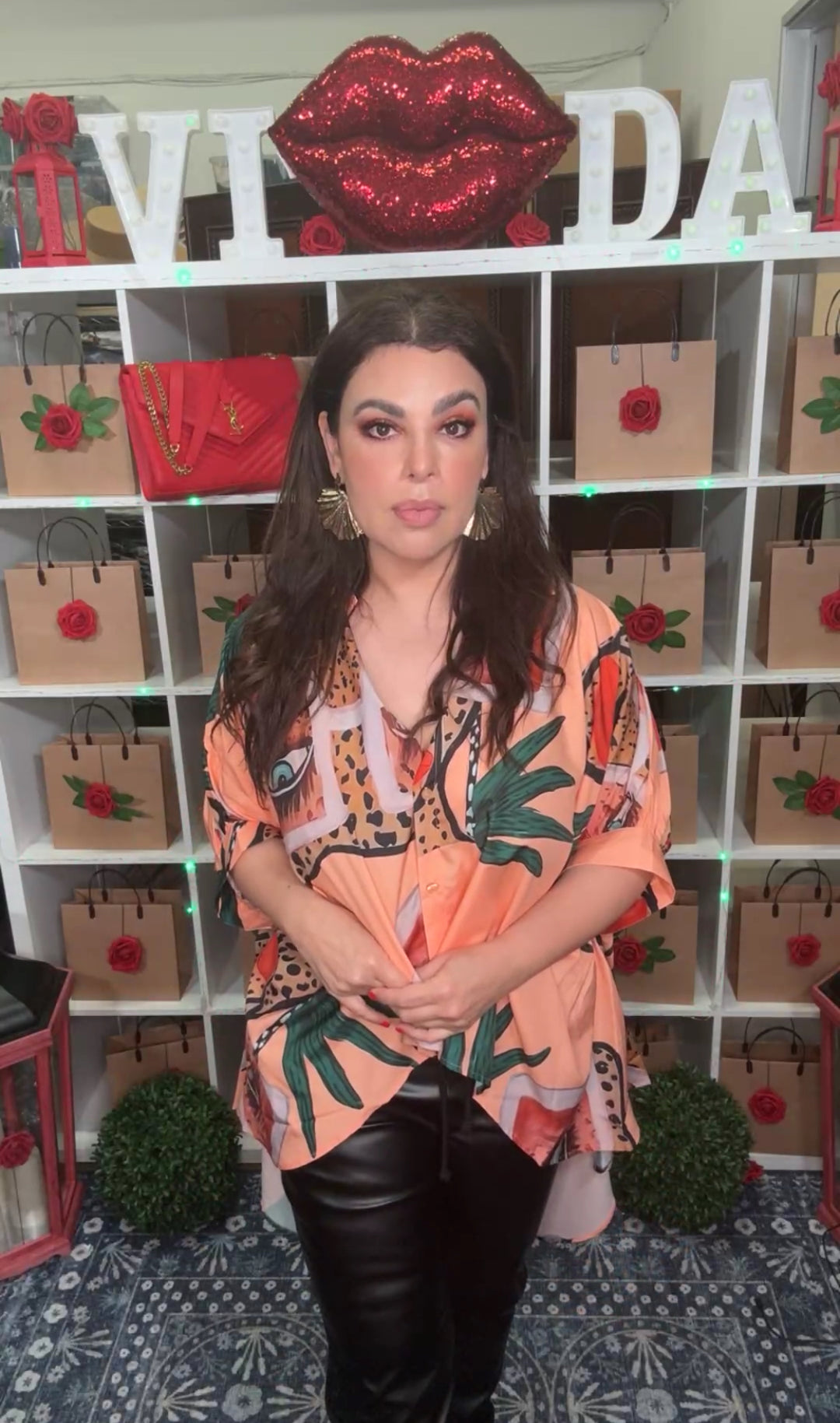 Arete Dorado Cascada Rojo y Verde Floral