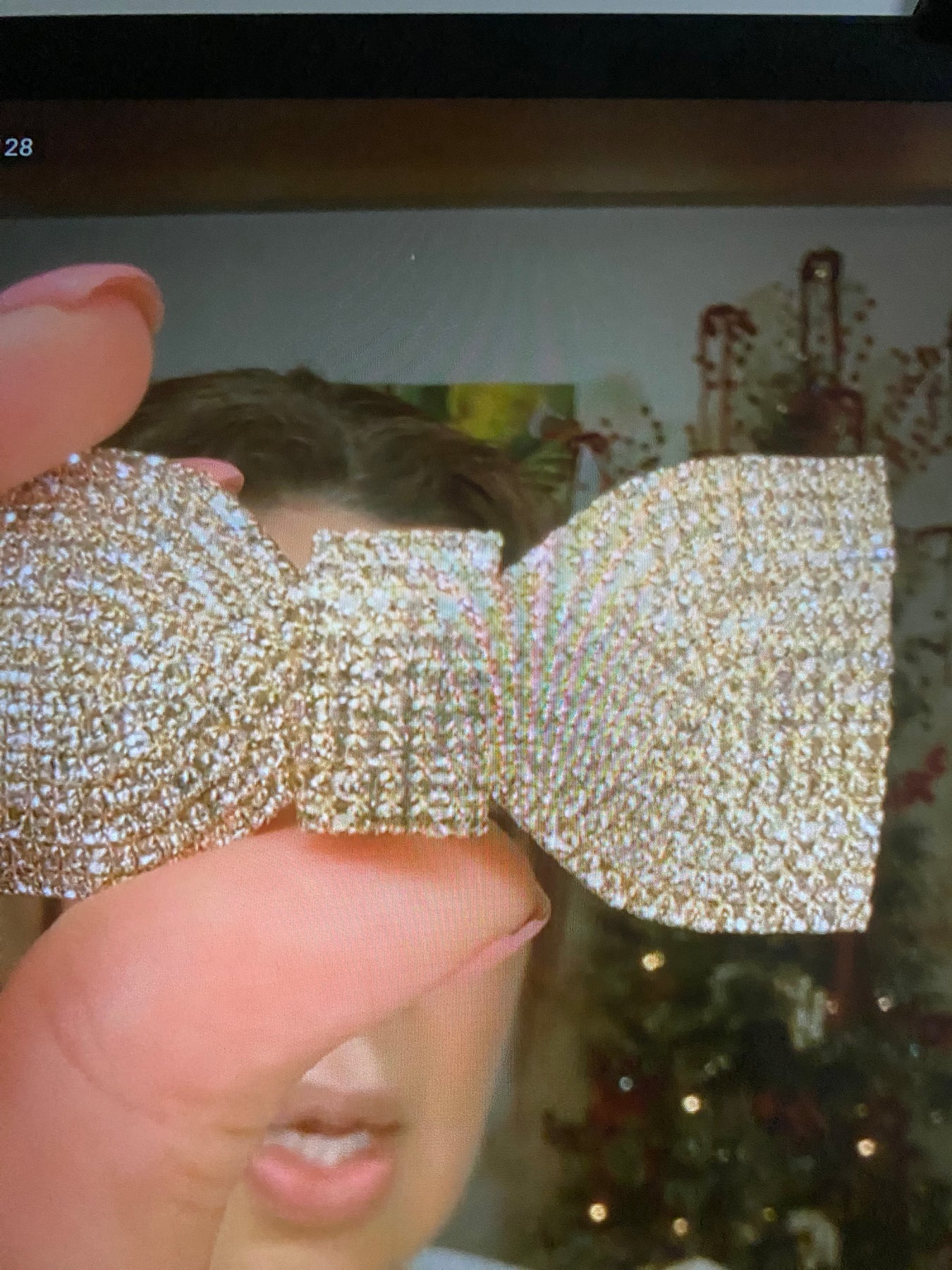 Pequeño y Brillante: Broche dorado con forma de moño adornado con pedrería. Ideal para sujetar mechones o como detalle lateral en un chongo.
