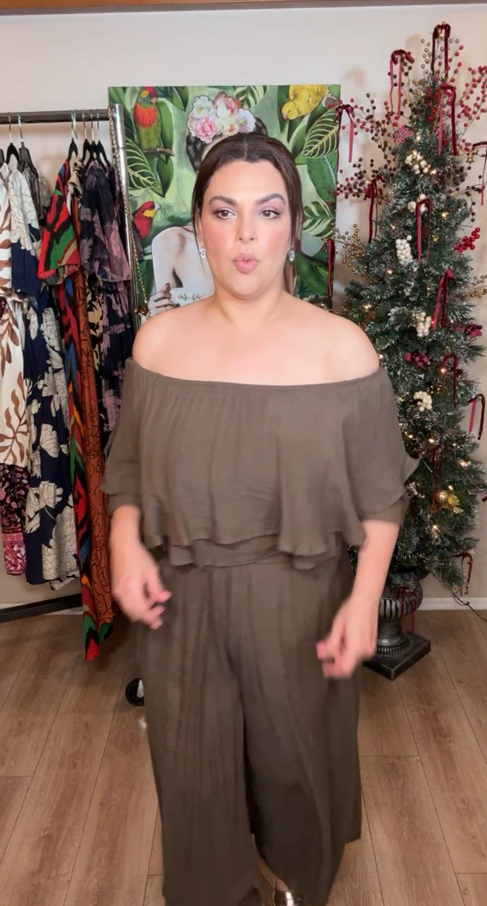 Versatilidad y Comodidad: Conjunto en color mocha con palazzo flowy y top sueltito. Erika usó talla mediana (busto 36DD) y elogió lo ligero y fresco de la tela.