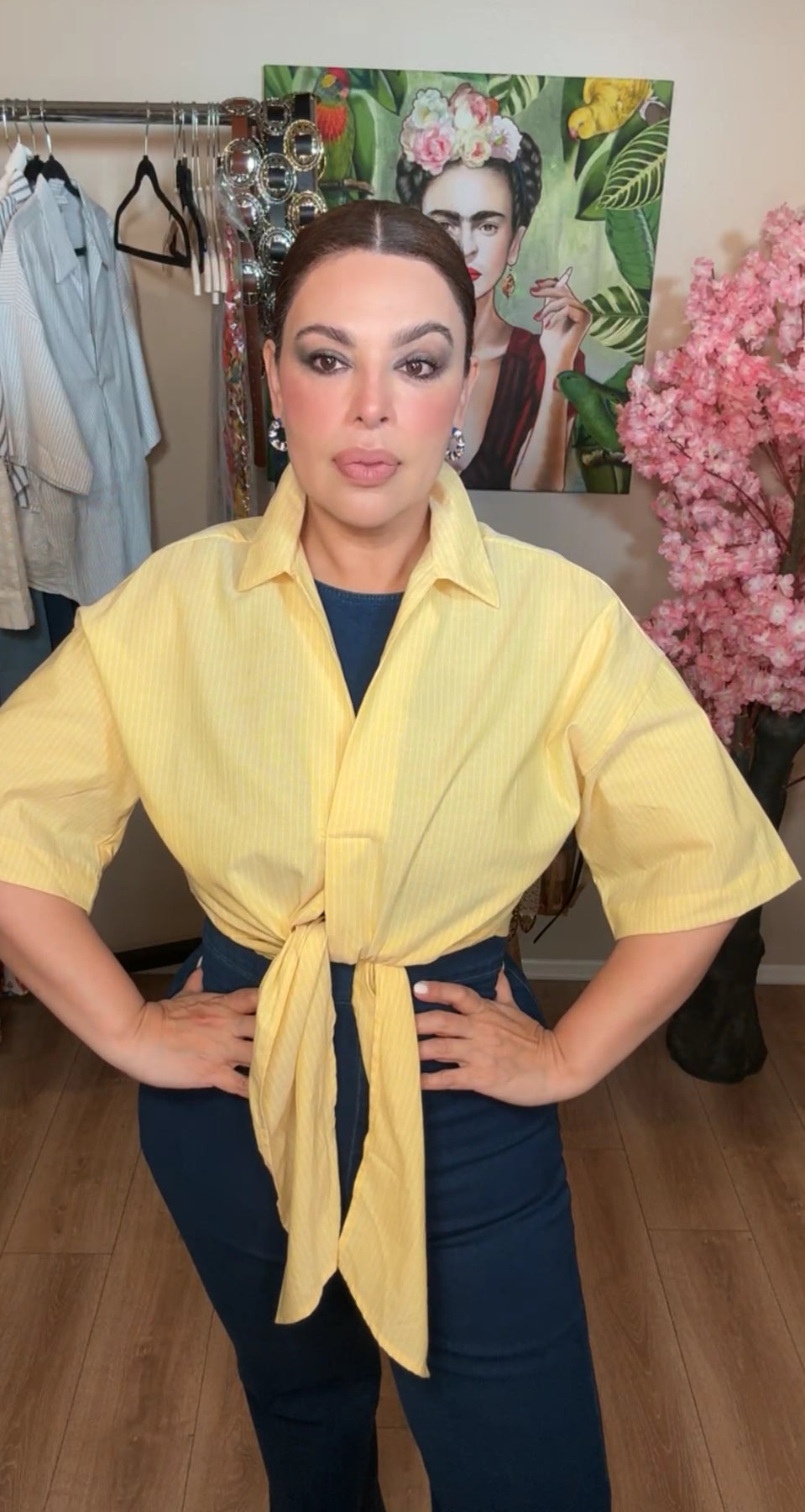Ilumina tu día con esta camisa amarilla de rayas blancas y nudo frontal. Su tejido ligero la hace perfecta para días soleados. 🌼⚪
