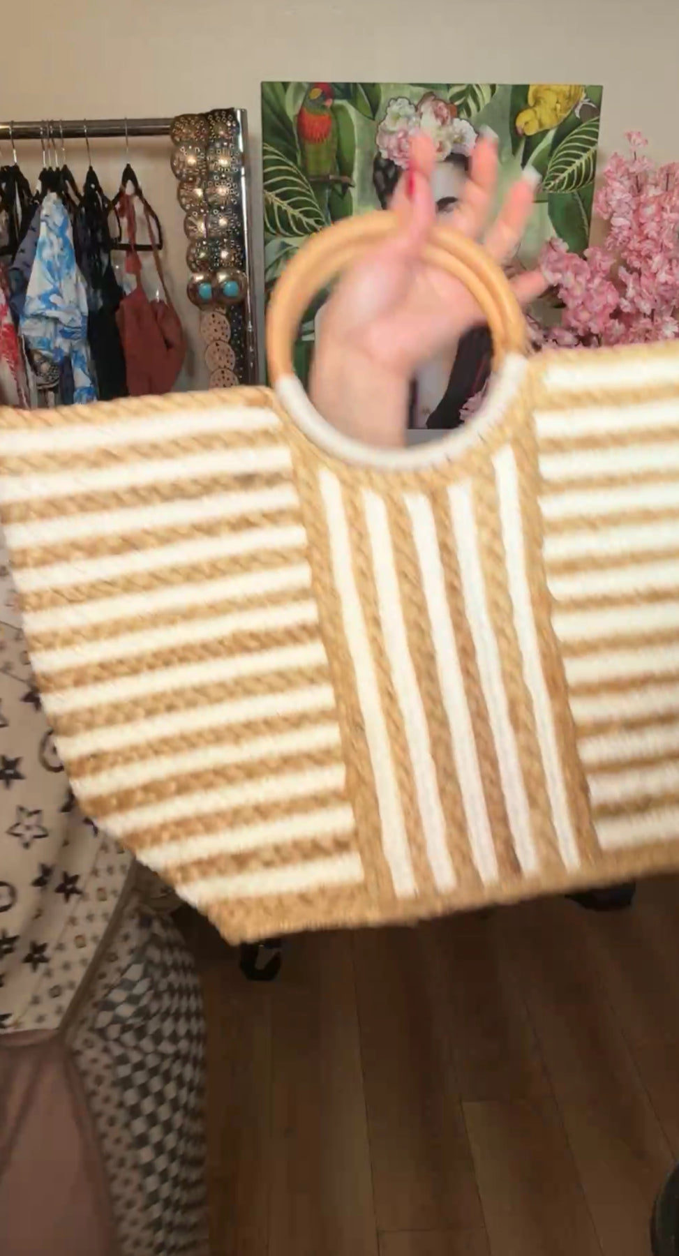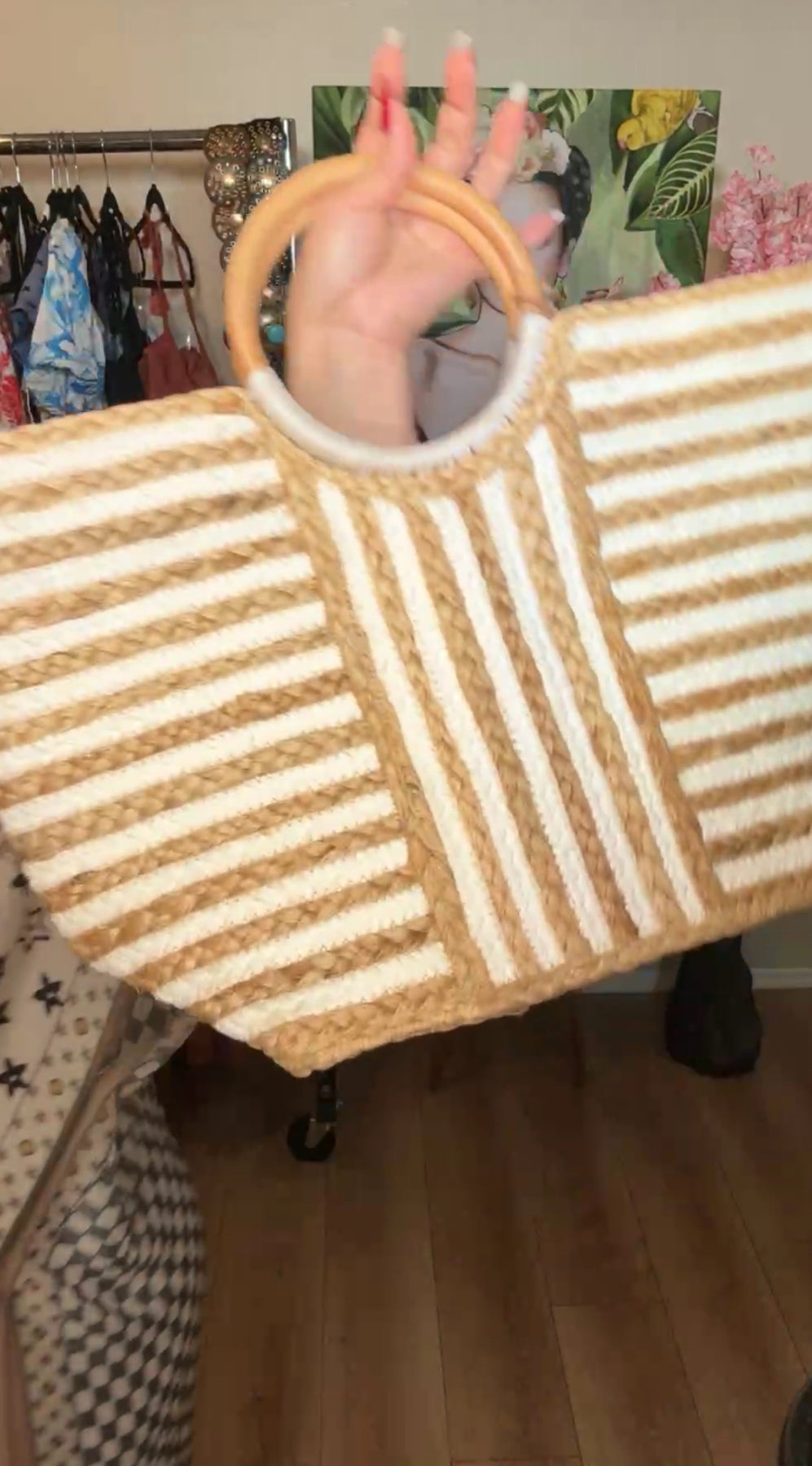 Amplia y encantadora, esta bolsa XL combina yute en tonos mocha y blanco, dando un aire veraniego y chic. Sus asas circulares de madera son resistentes y dan un toque rústico. 🌞🛍