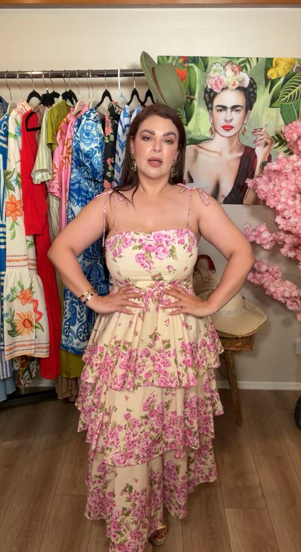 Vestido Beige Floral Morado Tirante Mono Gustable Midi.