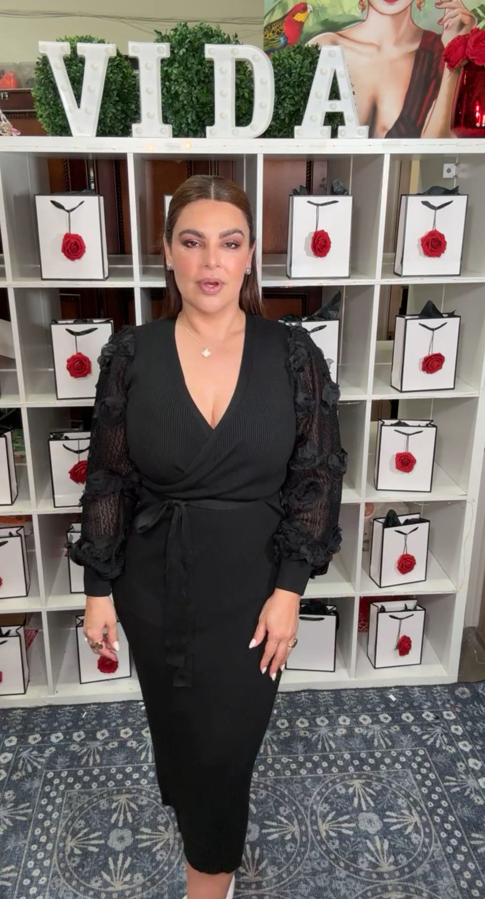 🖤🌸 Bodycon sweater-knit negro con mangas decoradas en flor 3D.