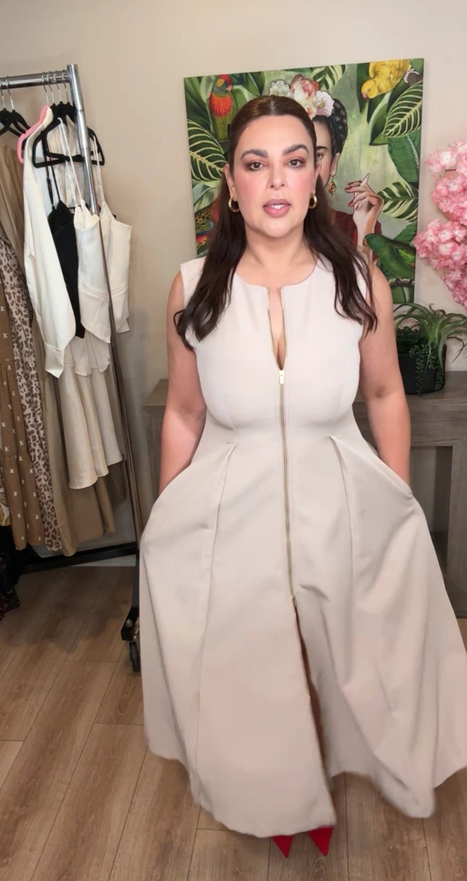 Vestido Khaki Claro Zipper Frontal Dorado Falda Fluida Midi