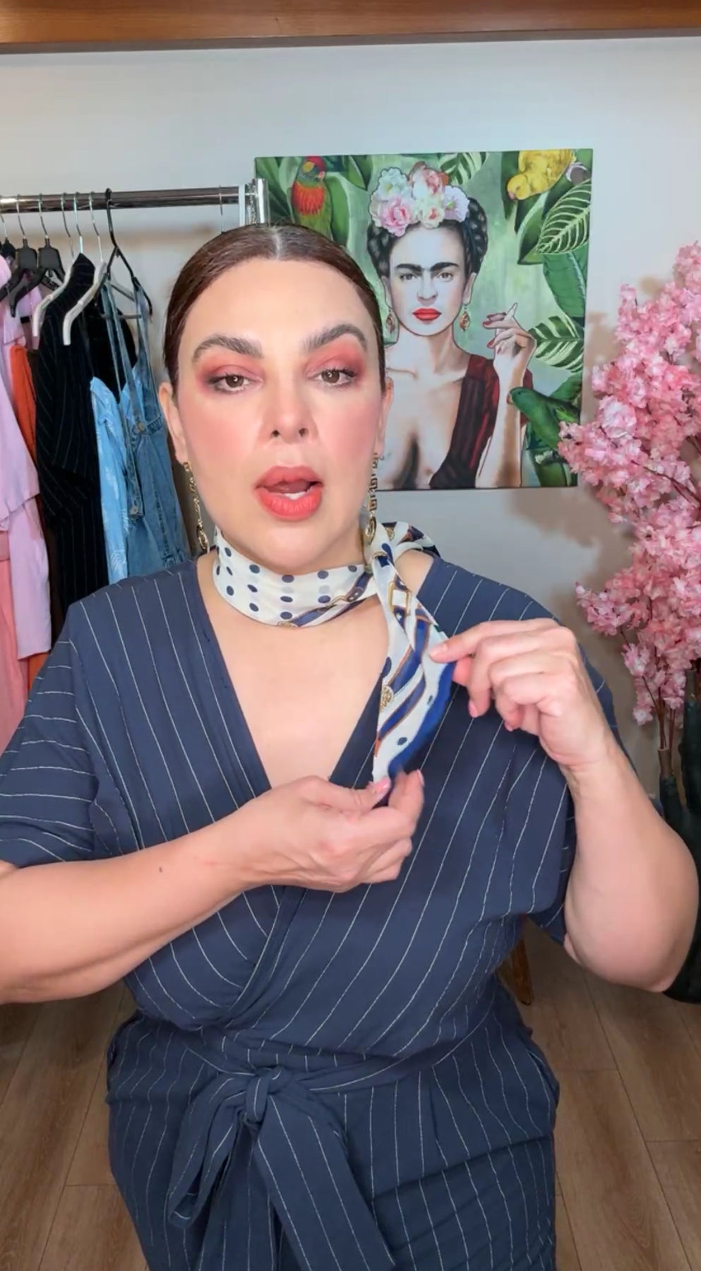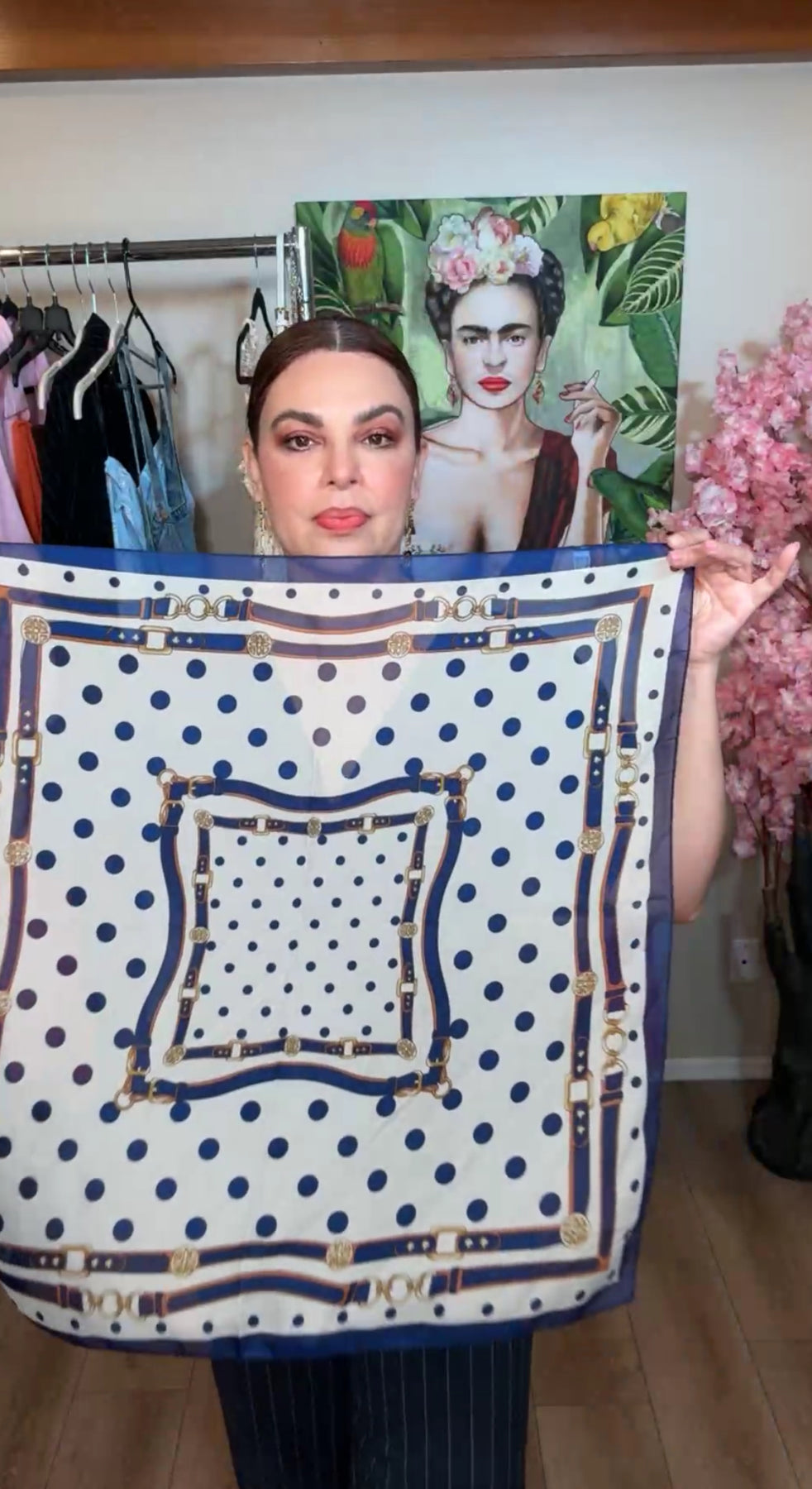 Dale un aire náutico a tu outfit con esta mascada en tonos azul y blanco. Erika la mostró atada al cuello y en el cabello, resaltando su versatilidad ⚓💙. Su tela suave permite ajustarla de varias formas, añadiendo un detalle elegante y divertido.